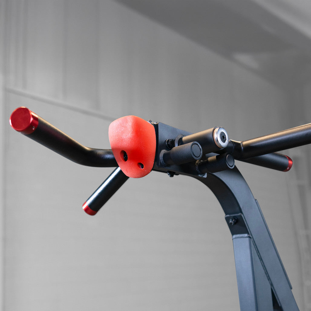 - Dip handles rotate out of the way for the other exercises