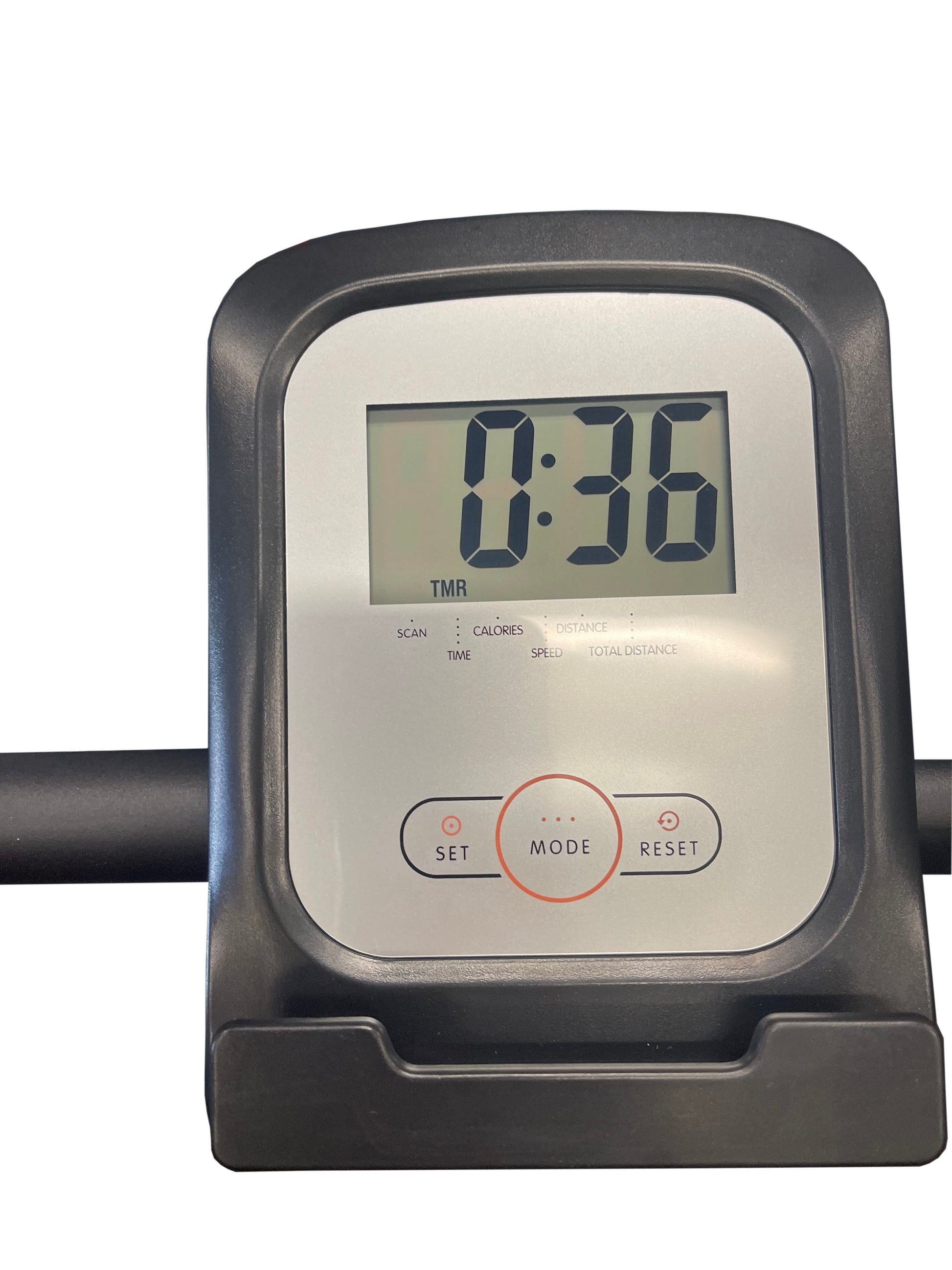 Console features: time, calories, speed, distance (mph), total distance, and scan. Consule takes two AAA batteries not included lol. Also has screen saver mode after 3 to 4 minutes. The consul will turn off. Consol turns on when you start walking on the belt.